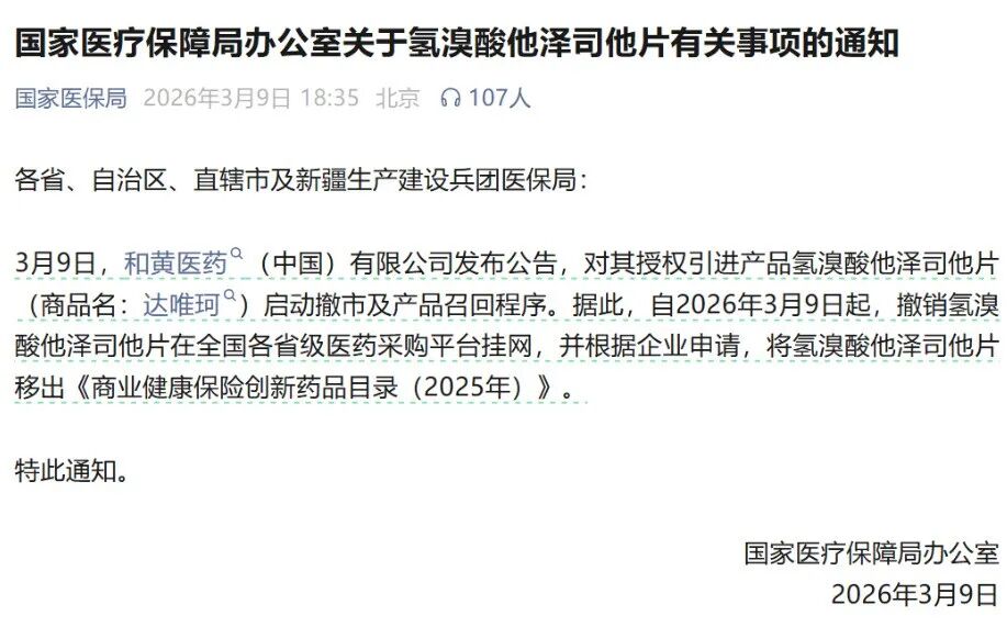 2026年3月9日,国家医保局发布通知,撤销氢溴酸他泽司他片(商品名:达唯珂) 在全国省级采购平台的挂网资格,同时将其移出《商业健康保险创新药品目录(2025年)》。背后原因是其全球开发方益普生(Ipsen)在确证性临床试验中发现了继发性血液系统恶性肿瘤的安全风险,评估认为风险超过临床获益,主动启动撤市及产品召回。